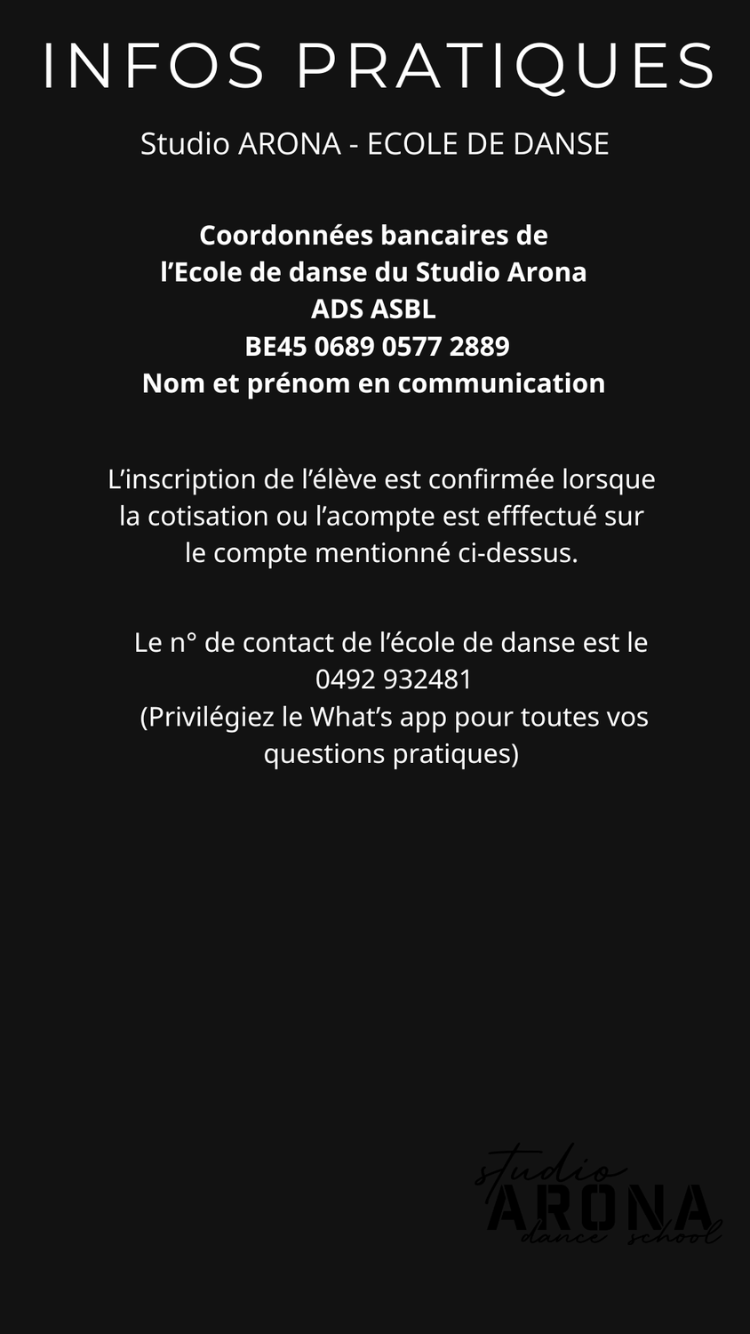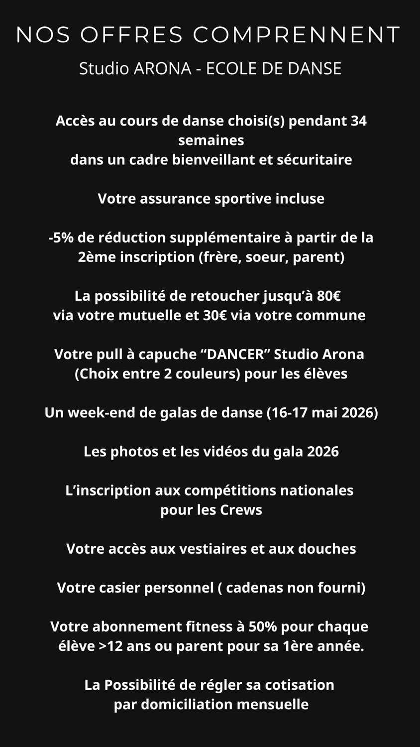 Au Studio Arona, la danse est plus qu’un cours : c’est un langage, une énergie, une communauté. Peu importe ton âge ou ton niveau, nos profs passionnés t’accompagnent pour apprendre, progresser et surtout prendre du plaisir. Ici, tu viens pour danser, mais tu repars avec bien plus.